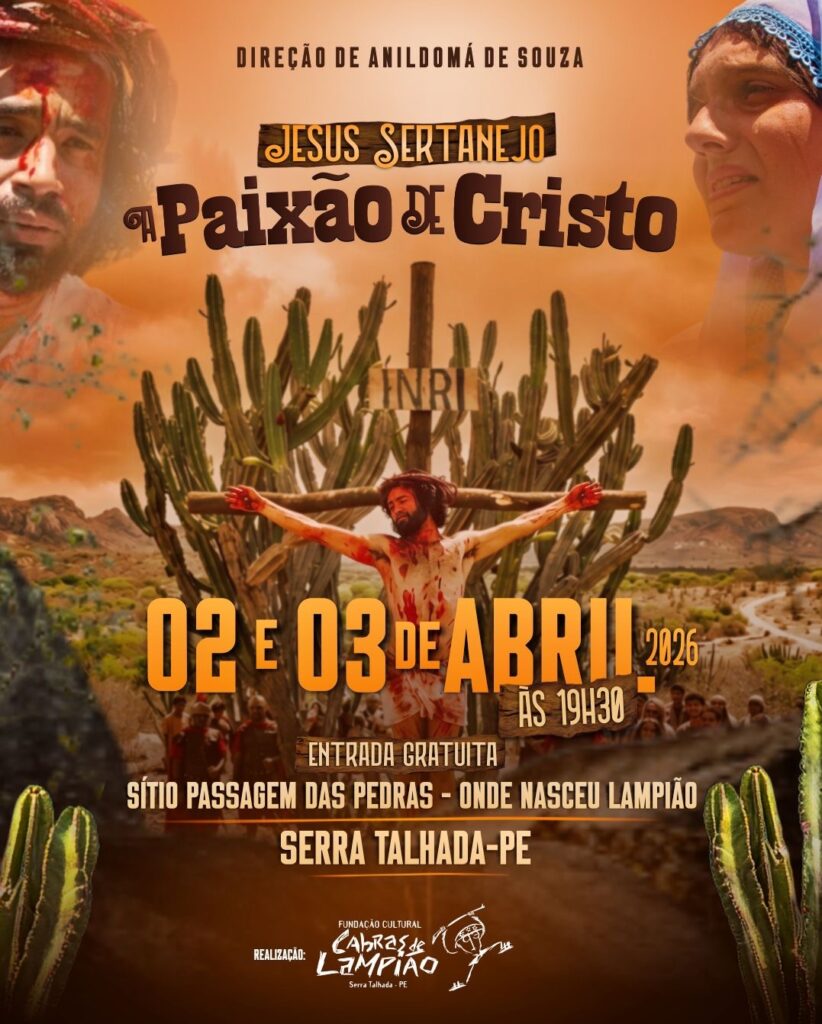 A Paixão de Cristo ganhará uma versão sertaneja em Serra Talhada. O espetáculo “Jesus Sertanejo – A Paixão de Cristo” será apresentado nos dias 2 e 3 de abril de 2026, no Sítio Passagem das Pedras, zona rural do município, local conhecido por ser o berço de Lampião.