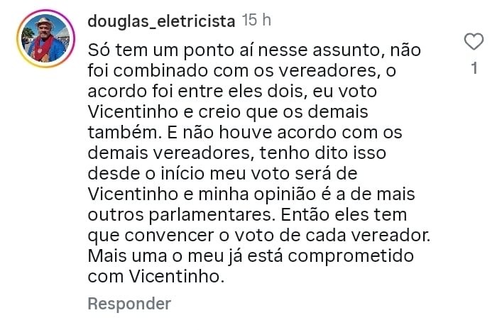 Segundo Douglas Eletricista, o acordo citado não envolveu todos os vereadores e teria sido restrito a um entendimento entre dois parlamentares. “Não foi combinado com os vereadores, o acordo foi entre eles dois”, afirmou. O vereador declarou ainda que seu posicionamento sempre foi público e que mantém apoio ao nome de Vicentinho para a presidência da Casa Legislativa.