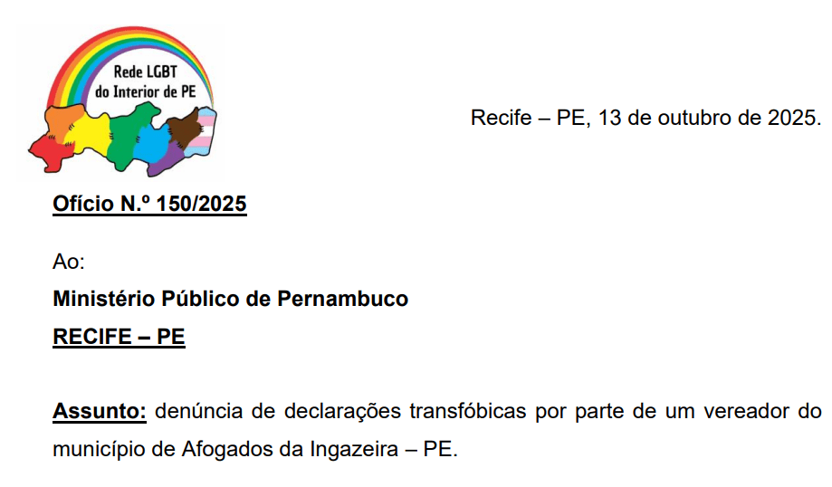 Transexuais e o Fórum LGBT de Pernambuco manifestam total repúdio às declarações transfóbicas do vereador Edson dos Cosméticos, proferidas durante a sessão ordinária da Câmara Municipal de Afogados da Ingazeira (PE), nesta quinta-feira, 9 de outubro de 2025, nas quais o parlamentar, de forma