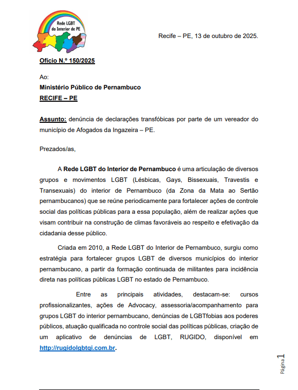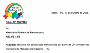 Transexuais e o Fórum LGBT de Pernambuco manifestam total repúdio às declarações transfóbicas do vereador Edson dos Cosméticos, proferidas durante a sessão ordinária da Câmara Municipal de Afogados da Ingazeira (PE), nesta quinta-feira, 9 de outubro de 2025, nas quais o parlamentar, de forma