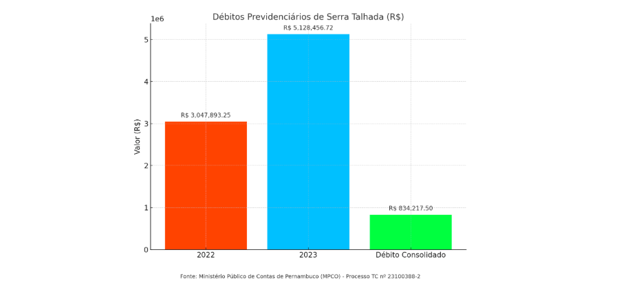 De acordo com o MPCO, os atrasos nos repasses e contribuições previdenciárias atingiram níveis milionários: R$ 3.047.893,25 não recolhidos em 2022 e R$ 5.128.456,72 em 2023, além de um débito consolidado de R$ 834.217,50 reconhecido pelo próprio Instituto.