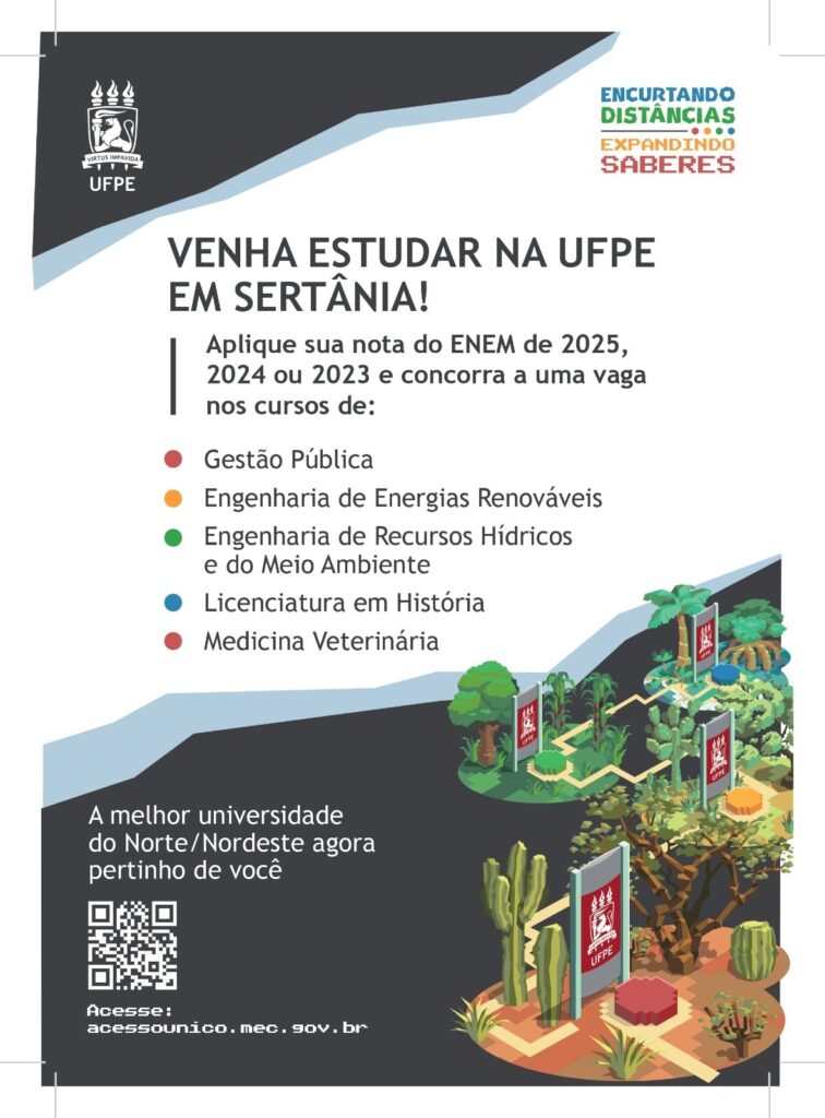 Os estudantes interessados nos cursos da UFPE em Sertânia deverão fazer suas escolhas quando o sistema Sisu estiver aberto para as inscrições, de 19 a 23 deste mês, no site https://acessounico.mec.gov.br/sisu. Poderá concorrer quem participou de, pelo menos, uma das três últimas edições do Enem: 2023, 2024 e 2025.